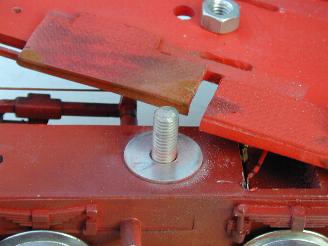 Die Drehgestelle wurden mittig des Fahrwerkes mit einer reichlichen starken Schraube - Mutter befestigt. Ja, mann hätte eine kleinere nehmen können, aber ich hatte nun mal keine und so verschleißt der Kronenbolzen niemals.