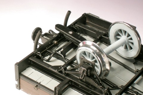 Der Puffer des Arbeitswagens wird mit einem Messingsdraht inter der Pufferbohle gefedert.