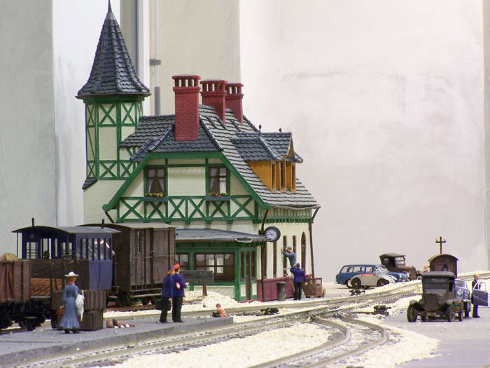 Übersicht über die Einfahrgruppe. In der Mitte die Gleise für die Personen bzw GmP`s. Im Vordergrund das Umfahrgleis. Links am Ladegleis stehen gerade Teile des GmP`s. Der Packwagen wird gerade entladen.