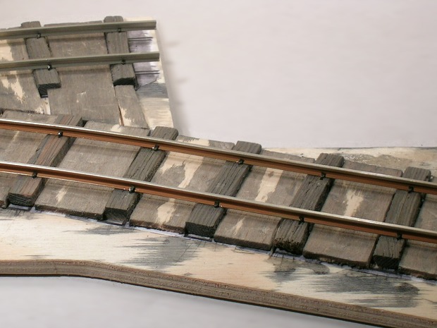 Das fertig genagelte Ausweichgleis oben auf dem Modul (bzw. hinten). Hier ist die Gewichts-sparende Wirkung der Balsa-Füllstücke gut zu erkennen.