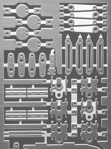 Detail der Steuerungs-Teile aus 0,5mm-Neusilber. Unten Teile für die Kreuzköpfe, oben Umlenkhebel und Exzenter-Scheiben.