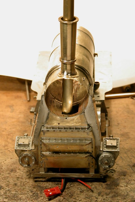 Die Lage des Schlots wird mit einem provisorisch eingesteckten 8 mm-Rohr gemittelt. An der Markierung vorne an der Rauchkammer und am Abstand am oberen Schlotende ist zumindest in einer Ebene gut zu sehen, ob das passt.