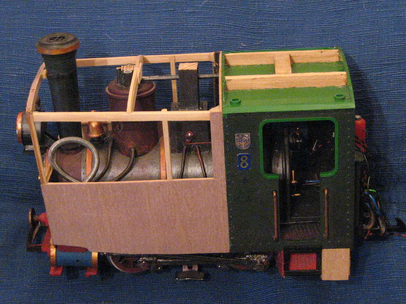Neuer Kastenaufbau von der Seite. Auch die Veränderung des Wassertanks unter dem Heck ist begonnen. - Die Furnierholzflächen schließen so gut wie exakt bündig an die Kunststoffflächen an.