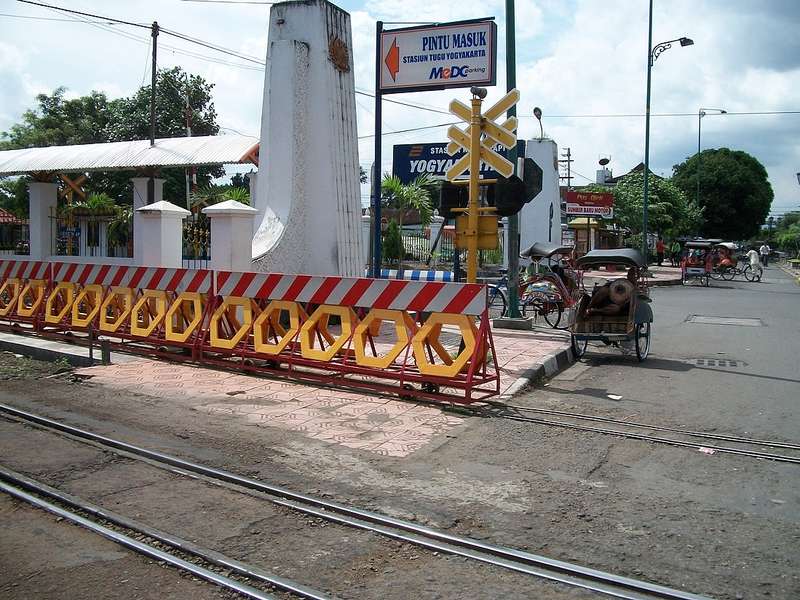 Auch wenn es überal Halbschrankenanlagen gibt oder daß das Bahnhof Tugu elektronisch überwacht wird, gibt es auch diese prëhistorisch anmutende Schrankenanlage (in kombination mit eine modernes Blinklicht), den Betjakfahrer macht es nicht aus, er genießt seine wohlverdiente Ruhepause.