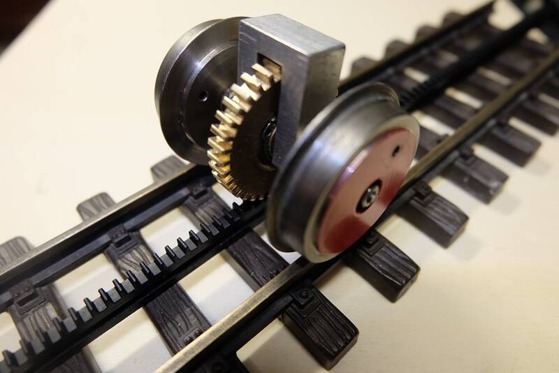 hintere Antriebsachse der ELOISE mit Zahnrad zum Zahnradbetrieb mit einer LGB-Zahnstange