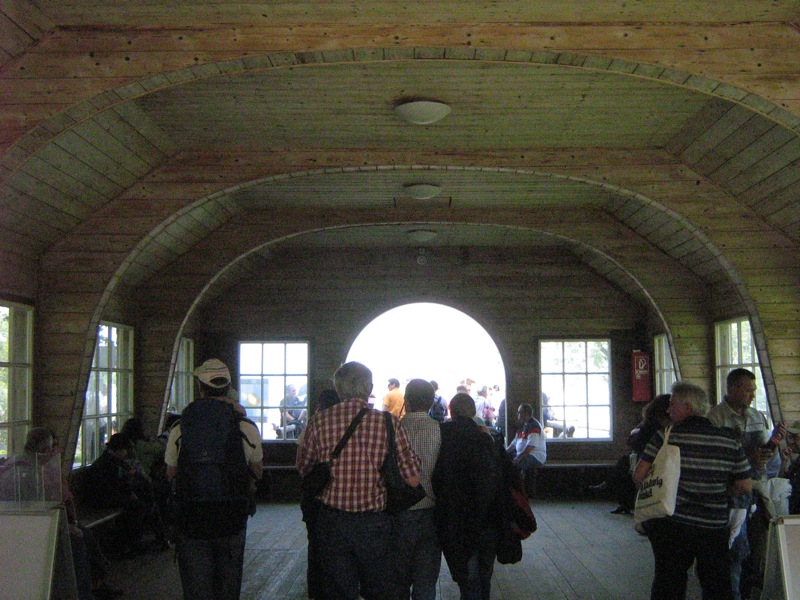 Innenansicht (Durchblick) der Wartehalle am Schiffsanleger auf der Herreninsel. Die Stützbalken verschwinden hinter elegant gespannten Bogenverkleidungen. Vorn geht man gleich weiter auf den Schiffsanleger hinaus.
