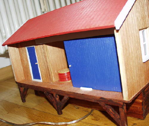 Der Zusammenbau vom Holz ging weitgehend problemlos, nur bei den Schiebetüren, braucht der Verlademeister noch ab und zu den Hammer. Die Führungsschiene haben wir etwas ausgeschliffen. Damit der Einblick ins Haus bleibt, haben wir nur eine Dachseite geklebt, die andere ist abnehmbar.