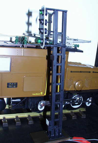 Die Lampen sind superhelle Leds, nicht billig aber auch tagsueber ist da Signalbild gut zu sehen. Beim ersten Exemplaere habe ich die Leds in einer kleinen Printplatte hinter dem Signalschild gesteckt und soldiert, aber das wirkt etwas bullig. Spaeter habe ich die Leds einfach in das Rohr gestochen und die Drahte direct mit den Kabeln verbunden.