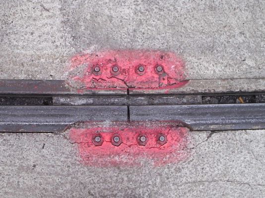 gesehen bei der Grazer Straßenbahn: es handelte sich wohl um provisorisch verlegte Gleise zur Umgehung einer Baustelle. Die Gleise sind einfach auf die Straße gelegt und anschließend mit Beton vergossen worden. Verbunden waren sie mit von oben verschraubten Schienenverbindern, die mit Warnfarbe markiert waren.