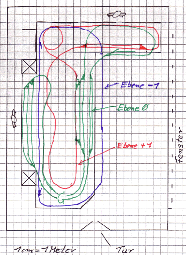 Hier mal die Daten, die wir zur Zeit haben. Der Raum, in dem wir die Anlage aufbauen, ist 11 x 15 Meter groß. Von der einen Stirnseite kommen die Besucher in den Raum herein. Auf der linken Seite sind zwei Pfeiler und auf der rechten Seite sind Fenster. Der Unterbau wird aus Tischen und Paletten bestehen. Für Auffahrten in eine zweite oder dritte Ebene steht Baumaterial in Form von Tischplatten und Kanthölzern zur Verfügung. Wir haben für den Aufbau ca. 2 Tage Zeit. Die Anlage soll einen großen Schattenbahnhof haben, den wir einsehen können. Der Betrieb sollte mit einem Mann problemlos zu bewältigen sein (1 Zug pro Gleis) , aber wenn mehr Leute da sind sollte es auch möglich sein, Züge zu tauschen (Schattenbahnhof) oder zu rangieren.