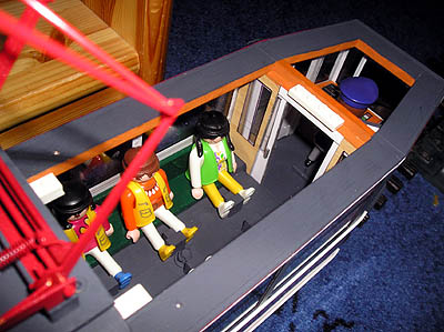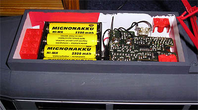 Der PM- RC-Antrieb wurde als Drehgestell umgebaut, die Elektronik und die Akkus wurden im Dach (nichtabnehmbare Hälfte) untergebracht. Neu war für mich auch die Art der "Lackierung". Hier verwendete ich selbstklebende farbige Folie.