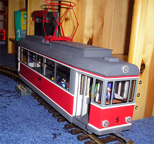 mein zweiter funkgesteuerter Straßenbahnwagen ist vor ungefähr einer Woche fertig geworden. Es ist ein vierachsiges Phantasiemodell und ist für meine Tochter bestimmt. Im Lastenheft standen einige Sachen, die ich bisher noch nicht gebaut hatte. So sollten die Einstiegs- und Plattformtüren zum Öffnen sein und auch das Dach sollte abnehmbar sein, damit man den Wagen auch gut mit PM- Figuren besetzen kann. Aus Stabilitätsgründen, aber auch technisch bedingt, ist nur die vordere Hälfte des Wagens "zum Spielen" freigegeben. Hier läßt sich die rechte Einstiegstür und auch die Plattformtür öffnen und schließen, auch das Dach kann hier abgenommen werden.