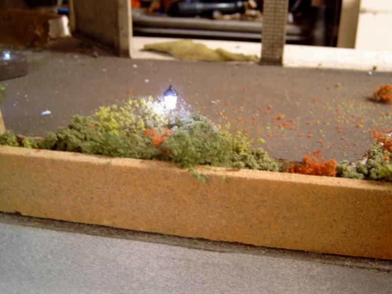 Bei den großen "outdoor"-Lampen habe ich mir mit Blitzableitern und Kupferlackdraht beholfen. Wer sich daran stört, kann den hölzernen Lampenmast mittels Cutter mit einem Schlitz versehen und diesen Schlitz nach Einlegen des Kabels mit Schleifspänen auffüllen und verkleben (ein alter RCMBBT: "RC-Modell-Boot-Bauer-Trick" zur Kaschierung der Empfangsantenne im Mast). Nach dem Verkleben und Trocknen werden die Späne geschliffen. Achtung: Bei Bedarf alles vorher beizen!