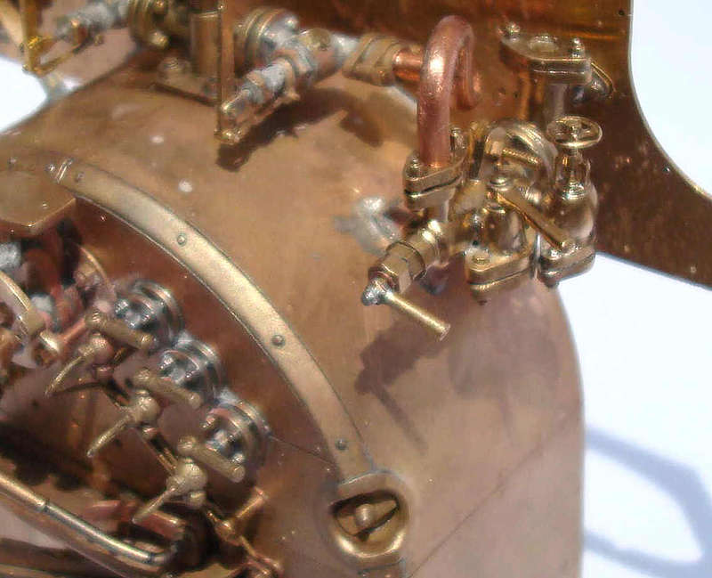 Danach können dann Dampfverteiler und Strahlpumpen am Stehkessel ausgerichtet und montiert werden. Die vorderen Flansche der Leitungen die zum Kesselspeiseventil führen, liegen dabei außerhalb der Führerhausvorderwand.