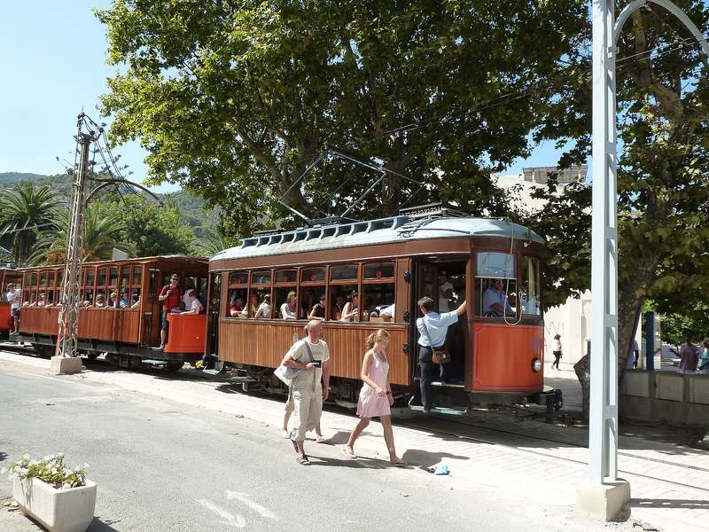 Die andere Seite des Wagens zeigt an der Endhaltestelle in Port de Soller zum Meer: