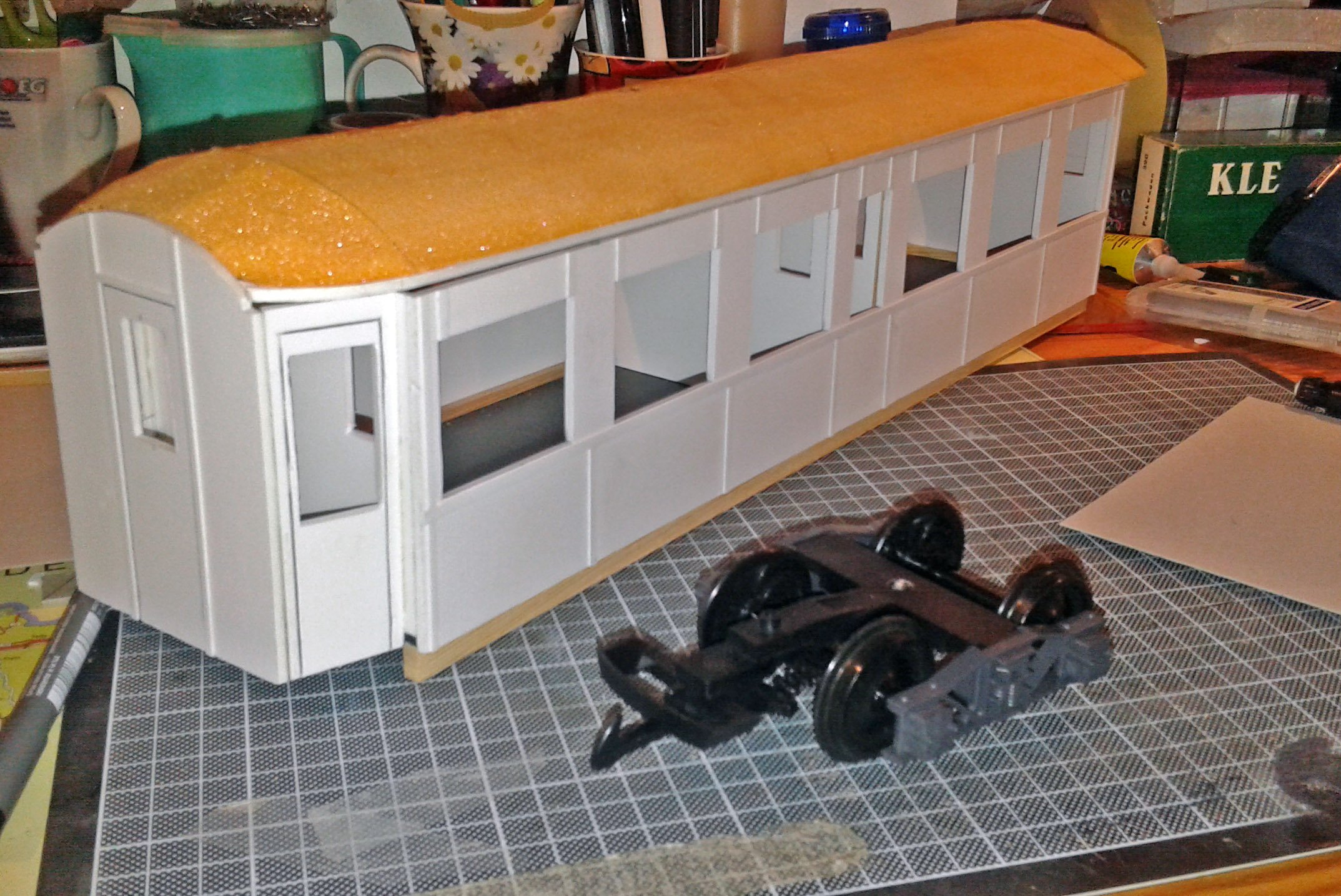 Ein ganz eigenes Thema war das Dach mit seinen eingezogenen Enden, es entstand aus einem mit Karton beklebten und zurechtgeschliffenen Kern aus Styrodur. Allerdings war aufgrund diverser Probleme ein Neubau des Daches notwendig, wobei hier gleich ein Kanal für die später zu ergänzende Innenbeleuchtung eingearbeitet wurde. Aber auch dieses zweite Dach, nun leichter gebaut, verzog sich nach dem Verkleben der einzelnen Abschnitte aus Karton. Ein grantiger Schlag mit der Faust und eine dadurch entstandene Dehnfuge zwischen zwei Segmenten (mit einer Deckleiste kaschiert) sorgten hier jedoch für überraschende Abhilfe. Ganz perfekt, vor allem an den Enden, ist das Dach noch immer nicht - aber für den Anfang reichts!