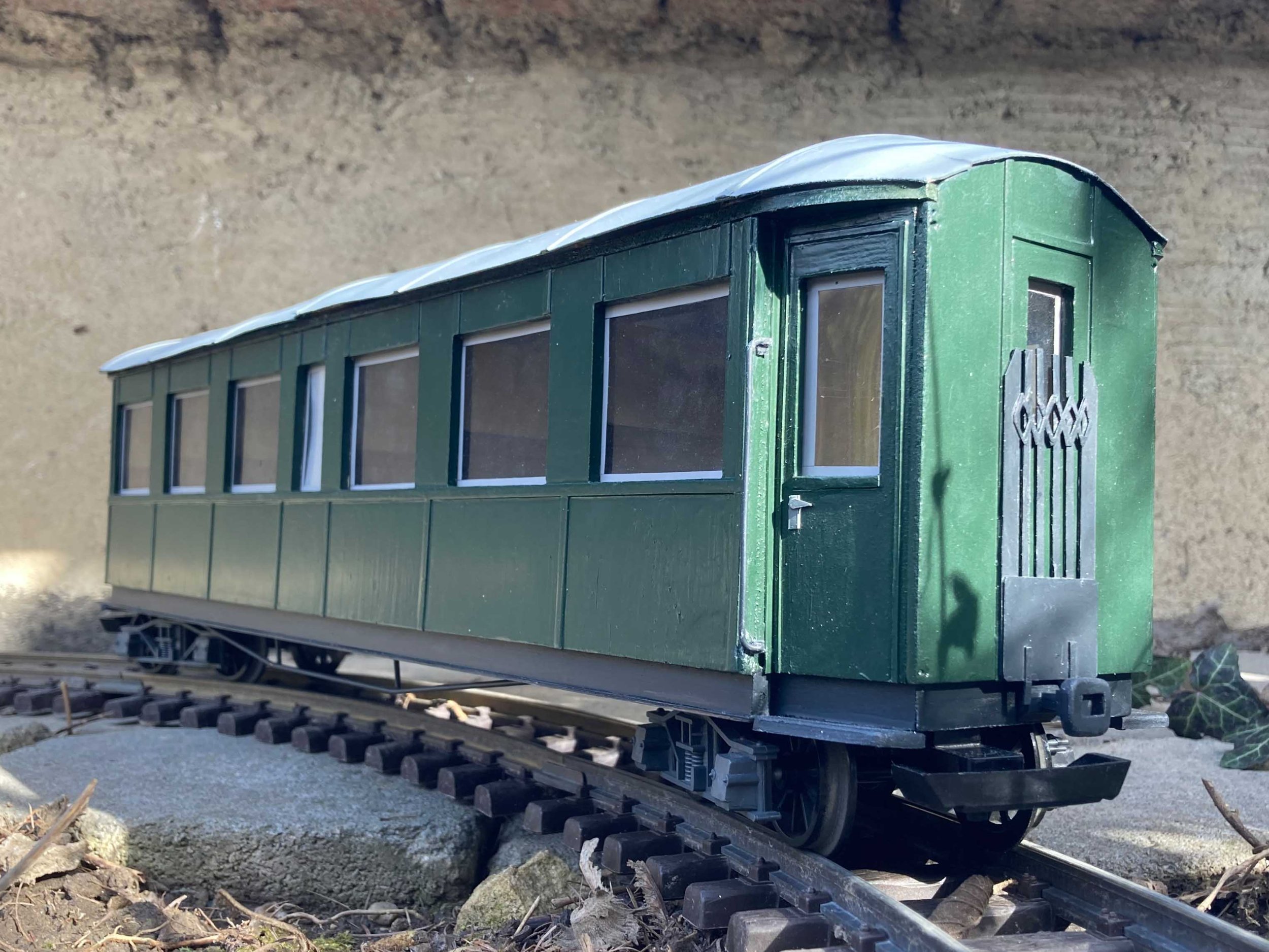 Die Drehgestelle wurden noch ziemlich brutal mittels in den Innenraum ragender M3-Schrauben an hölzernen Querbalken befestigt. Zusammen mit Beilagscheiben ergab sich jedoch ein recht gutes Fahrverhältnis auch auf meinen unsauber verlegten Schienen im Garten.