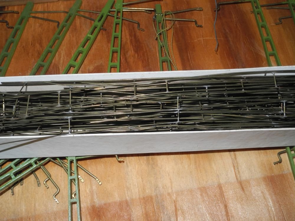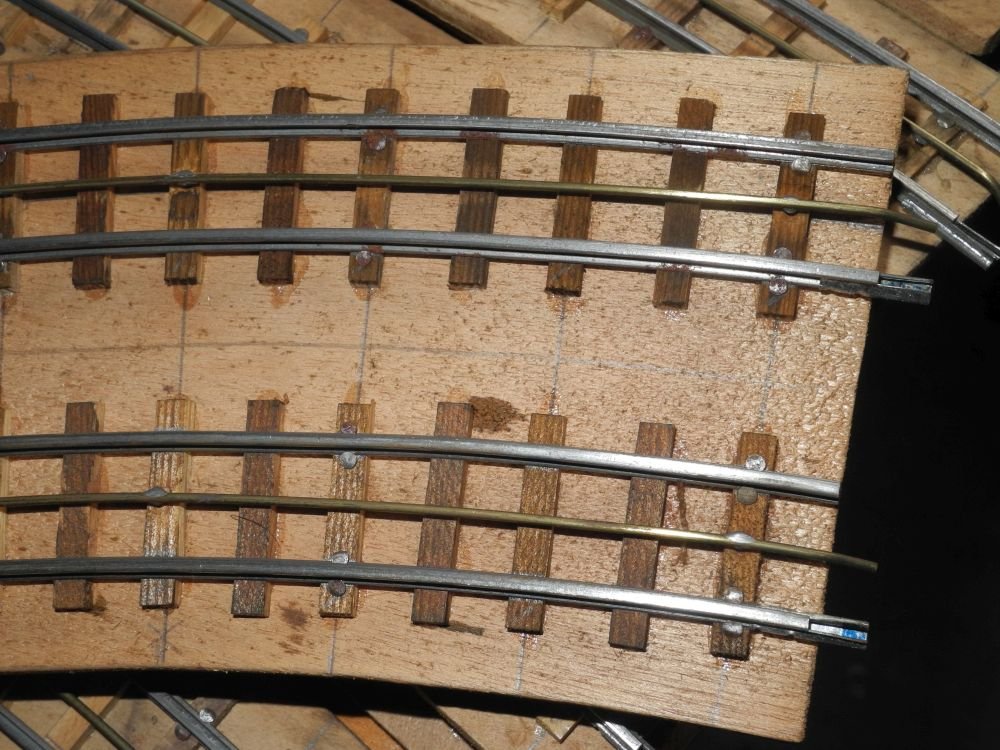 Die Schwellen sind Holzleisten, ich habe es spaßeshalber mal hochgerechnet, der Erbauer dürfte so an die 1400mal gesägt haben. Von den Auflagebrettchen ganz zu schweigen. Und der Mittelleiter besteht aus handverlöteten 1mm Messingsdrähten, die lose eingesteckt sich und sich am Gleisende berühren.