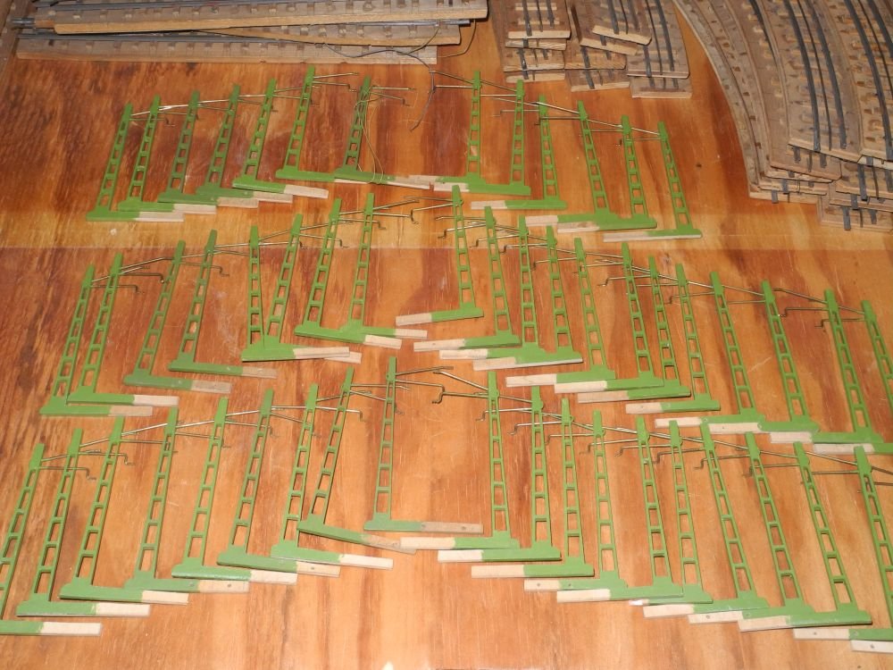 Als Kirsche auf der Sahnetorte hat der Erbauer auch noch eine passende Oberleitung angefertigt, mit an die 50 Masten, alle wohl mit der Laubsäge aus Sperrholz ausgesägt. Mit dünnen Fahrdrähten, die Märklin erst 60 Jahre später zustande brachte.