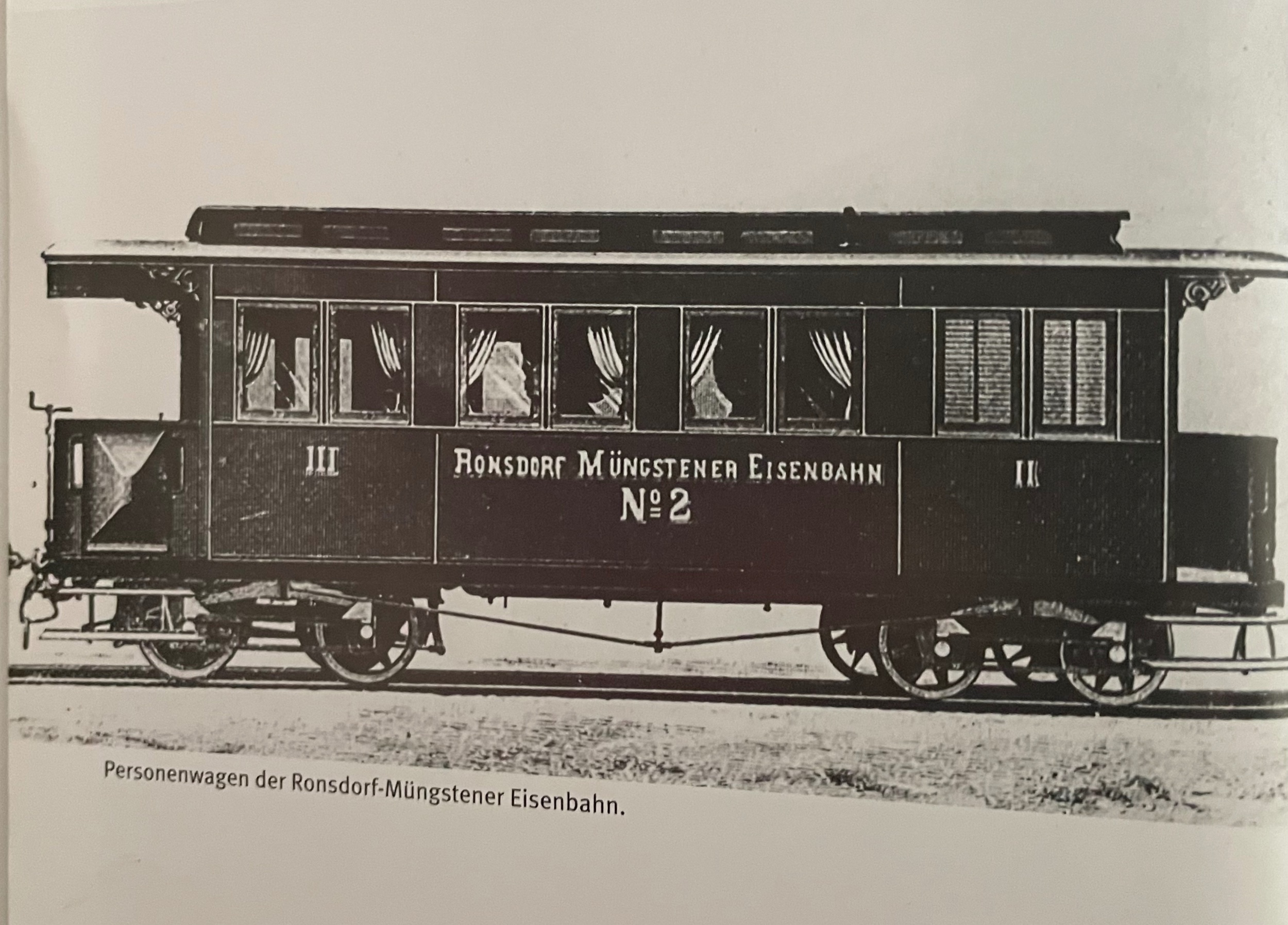 Noch etwas Hintergründiges. Die Ronsdorf-Müngstener Eisenbahn AG nahm 1891 ihren Betrieb auf einer Strecke von ca. 12,5 km zwischen Ronsdorf und dem Solinger E-Werk Grunenburg an der Wupper auf. Ihr Ziel war vorrangig die Versorgung der Betriebe, die von Wasserkraft auf Dampfmaschinen und vom Schwanzhammer auf Dampfhämmer umgestiegen sind, mit Kohle zu versorgen. Daneben wurde mit einem kleinen Dampfzugbähnchen und meist nur einem Personenwagen ein Personenverkehr zwischen Ronsdorf und Müngsten eingerichtet.