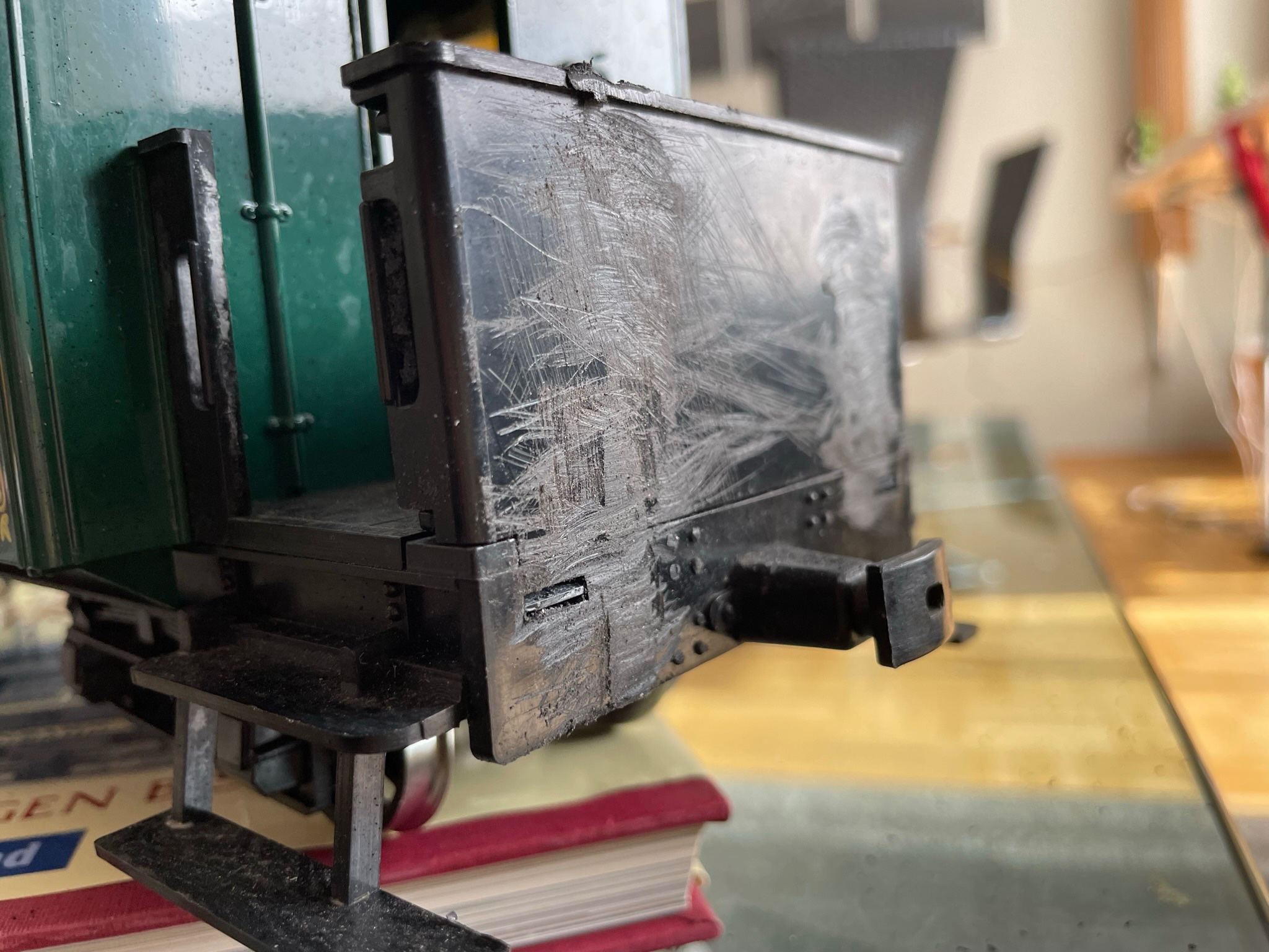 Da waren natürlich zuerst die Spielzeugkupplungen an den Drehgestellen. Weg damit. Die Schornsteine sind jetzt auch vom Dach weg, der Wagen Nr. 2 war auch im Winter ohne Öfen unterwegs.