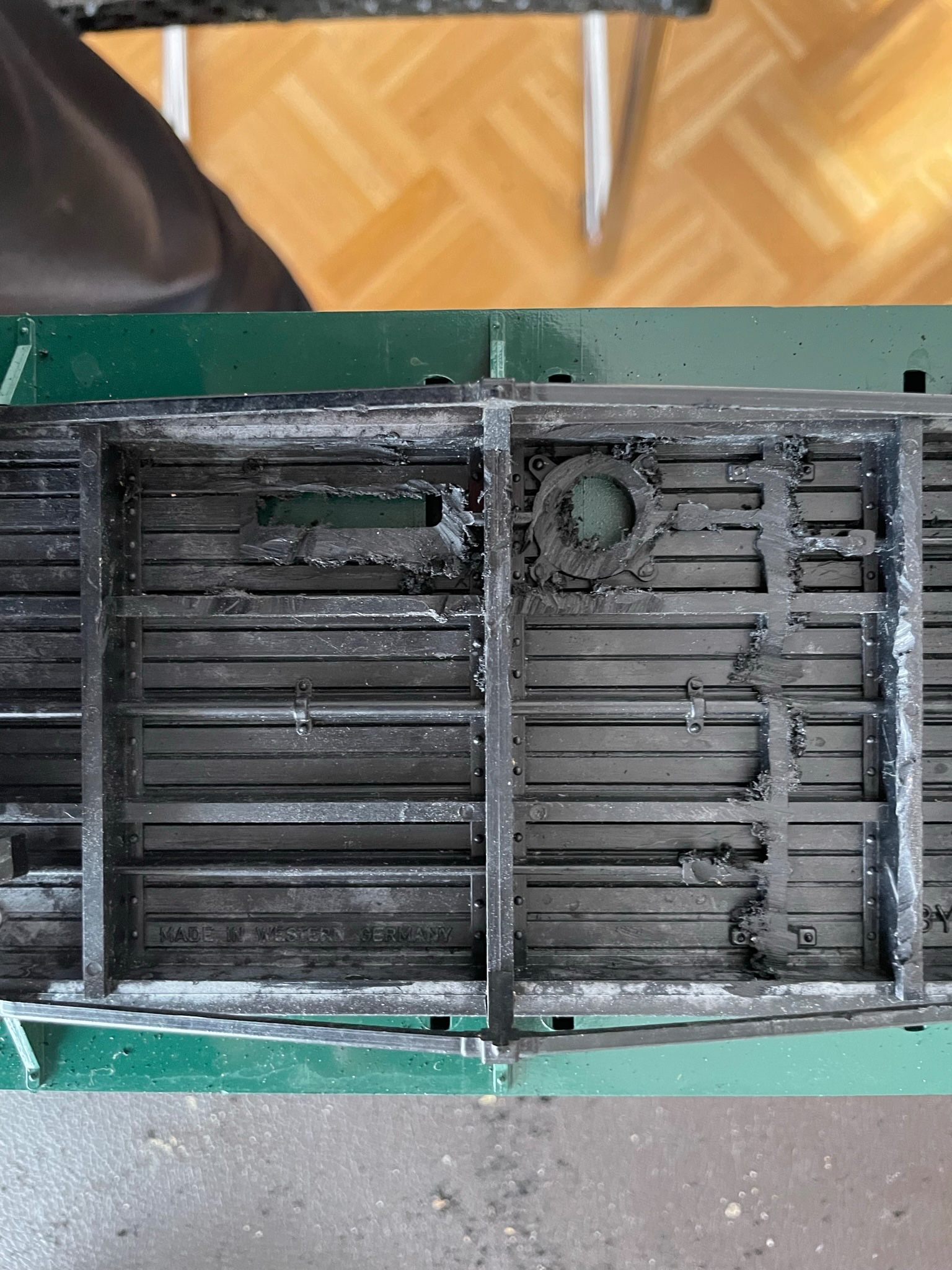 Heute ist der in eBay ersteigerte LGB-Wagen bei mir angekommen. Sofort habe ich den Proxon mit kleiner Trennscheibe in die Hand genommen und alles grob weggemacht, was das Vorbuld nicht hatte: