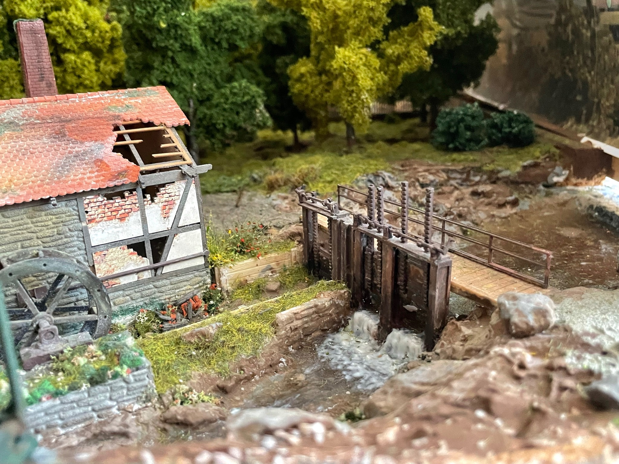 Nebenbei erwähnt. Ein zweites, schon weit fortgeschrittenes Funktionsdiorama des fiktiven Örtchens Siepershammer im Morsbachtal um 1930 im Maßstab 1:87. Hier dirchfährt gerade die „Müngsten“ der Barmer Bergbahn die zu Remscheid-Hasten gehörende Ortschaft im Morsbachtal. Mehr davon einmal später, wenn der Wagen Nr. 2 fertig ist,