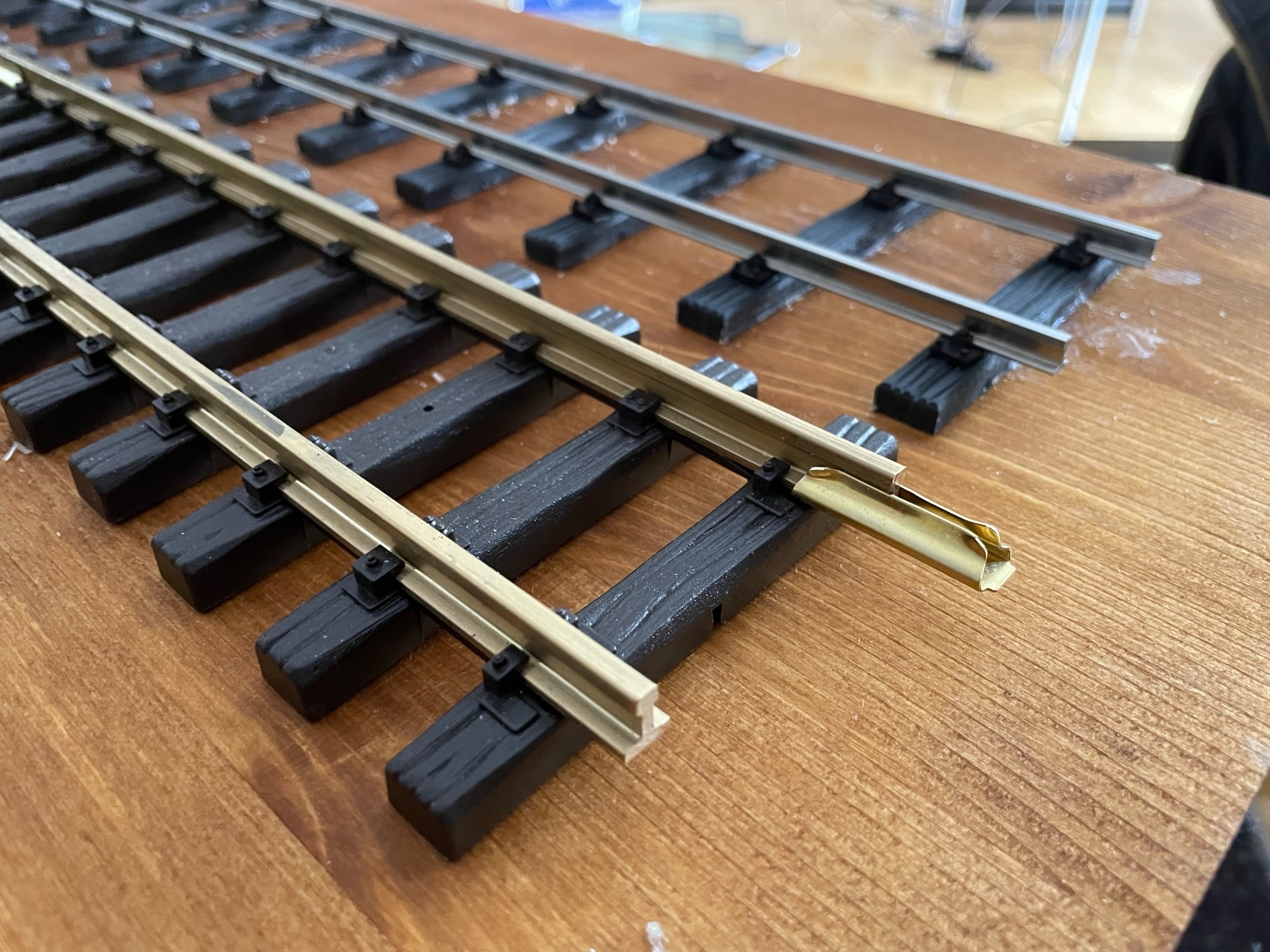 die Spachtel- und Schleifarbeit ist langwierig. Eine große Pause habe ich genutzt, um ein Regalbrett zu Repräsentationszwecken mit einem 90 cm langen Gleis zu versehen. Gewählt habe ich ein Code 250-Gleis (entspricht etwa der preussischen Form 15c). Entsprechend dem Vorbild (Bahnbetrieb 3. Ordnung) beträgt der Schwellenabstand 31 mm. Hier ein optischer Vergleich mit dem LGB-Gleis.