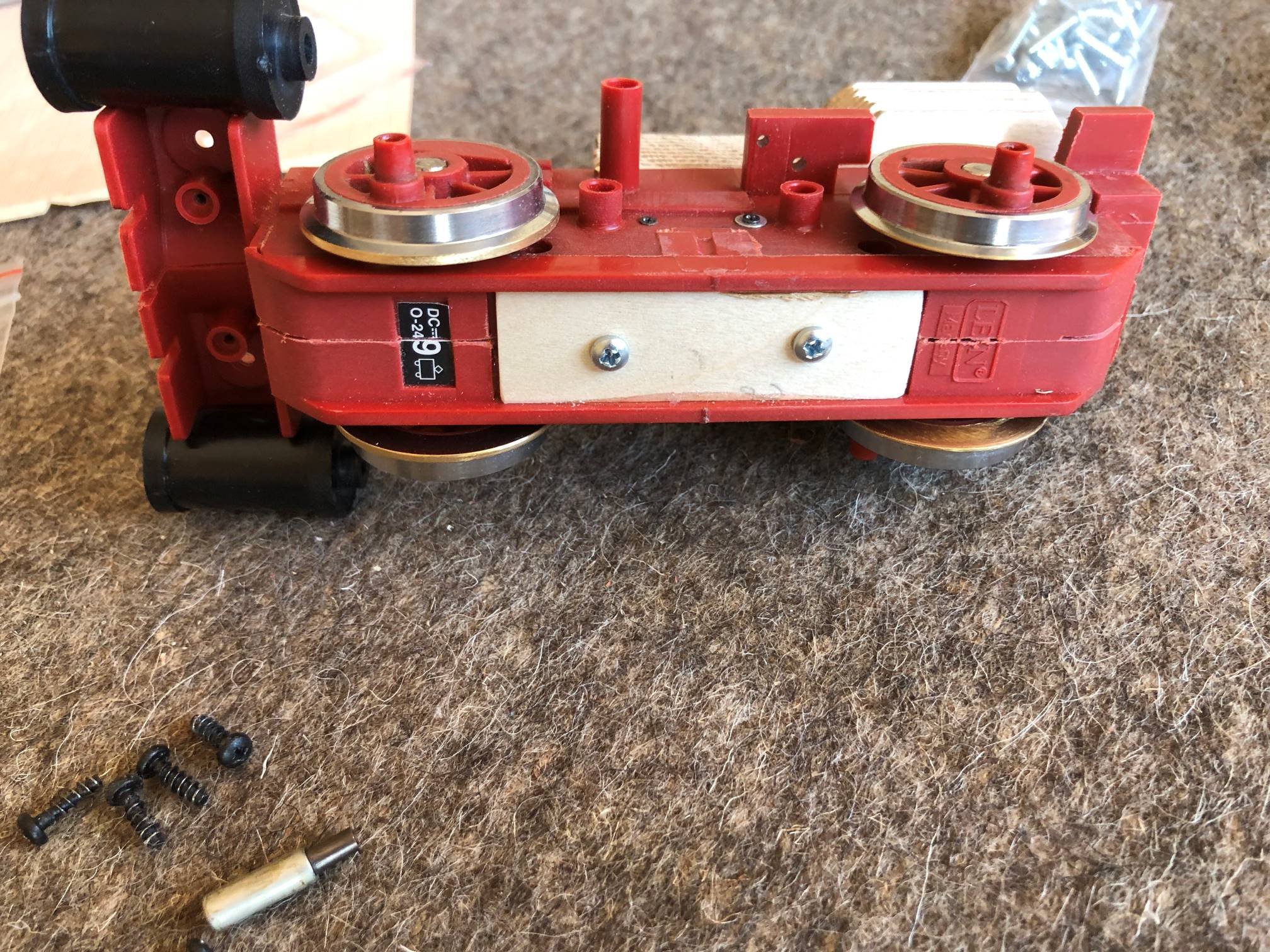 Von unten, man sieht gut, wie ich die LGB Teile des Fahrwerks schmaler gesägt habe. Neue Motor Besfestigung: Jetzt meine Frage: