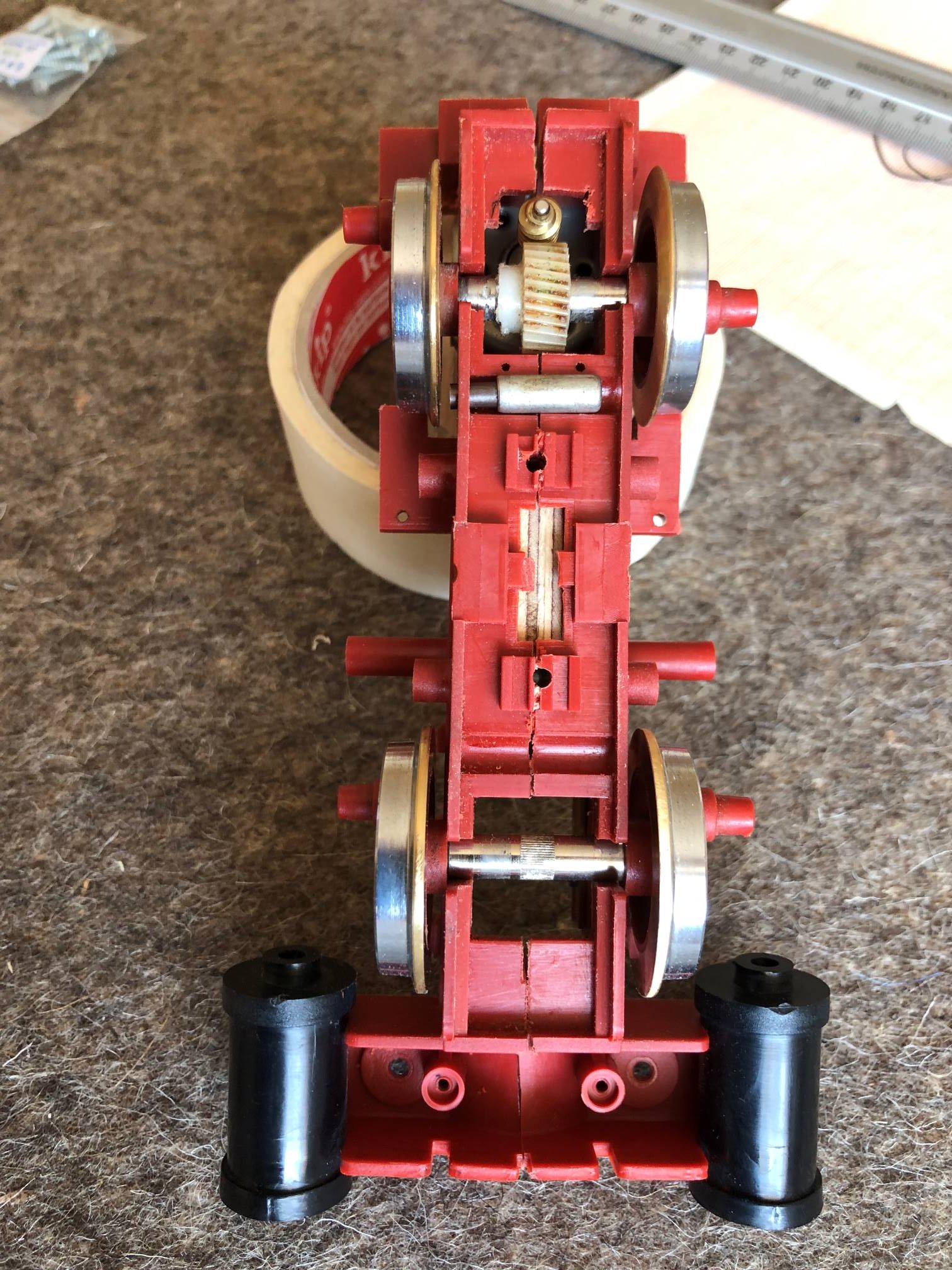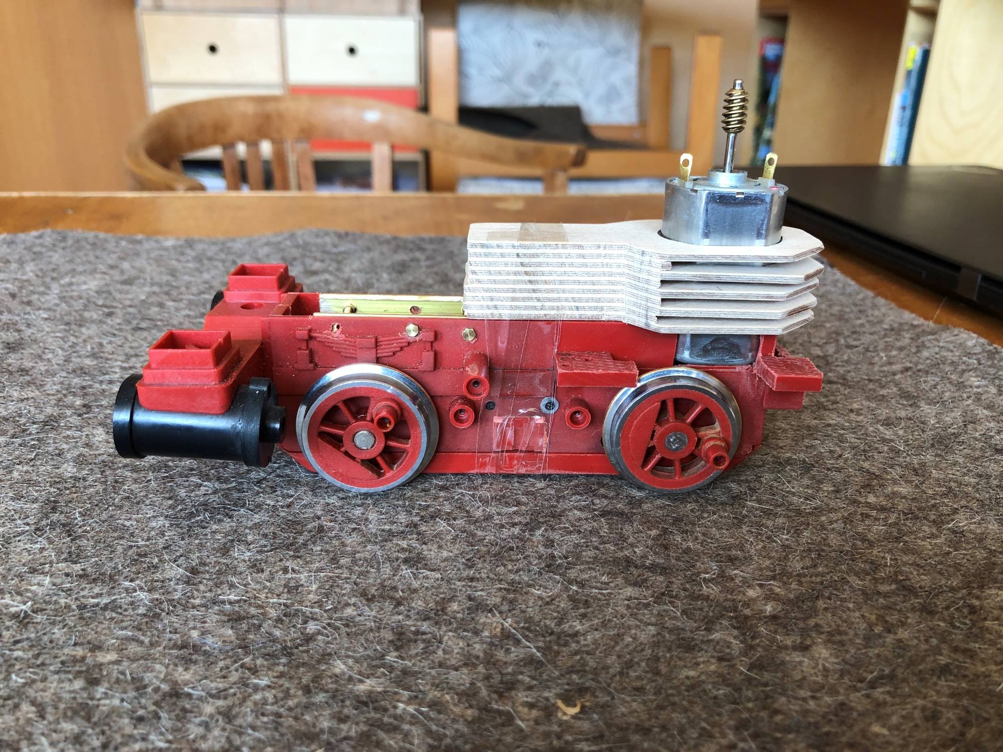 Den nun zu breiten Motor habe ich vertikal montiert. Es ist nur eine Achse angetrieben.