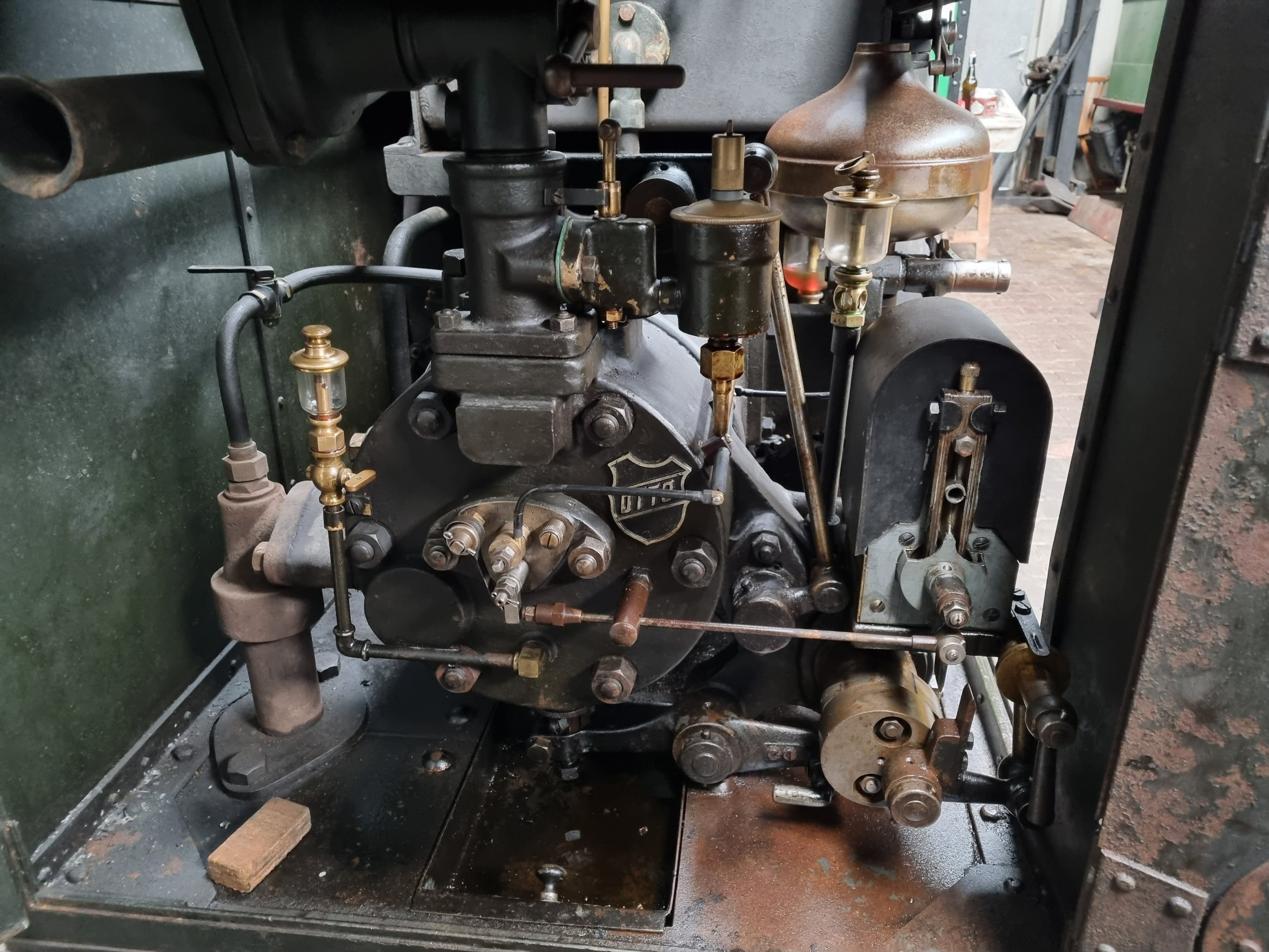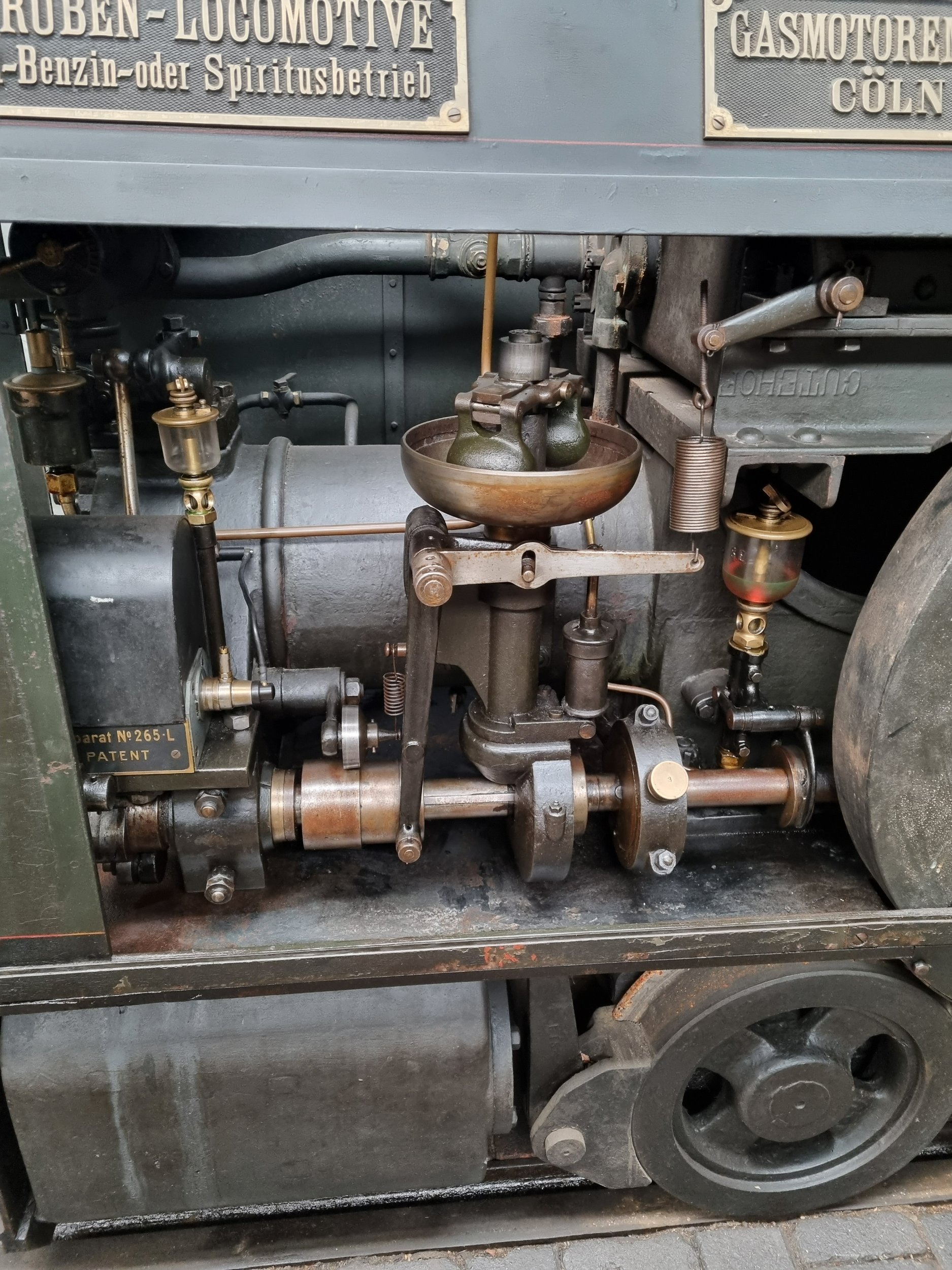 Die Drehzahl des Motors soll wie beim Original konstant (1500 U/min, Original 300 U/min) bleiben. Darauf gehe ich später bei Motor und Getriebe noch ein. Das folgende Bild zeigt den Zentrifugalregulator der Feldbahnlok (Deutz, Baujahr 1905) im Feldbahnmuseum Frankfurt mit abgenommenem oberen Schutzgehäuse (linke Seitenansicht), darunter mit Schutzgehäuse (rechts oben, Ansicht von vorn). Im Original wird die Niederspannungsabreißzündung reguliert. Bei der M12 Maschine im Modell wird die Drehzahl über das Standgas in Zusammenhang mit den Schwungrad eingestellt. Bei 1500 U/min läuft meine Lok Originalgeschwindigkeit im Maßstab 1:20 (4 bzw. 12 km/h).