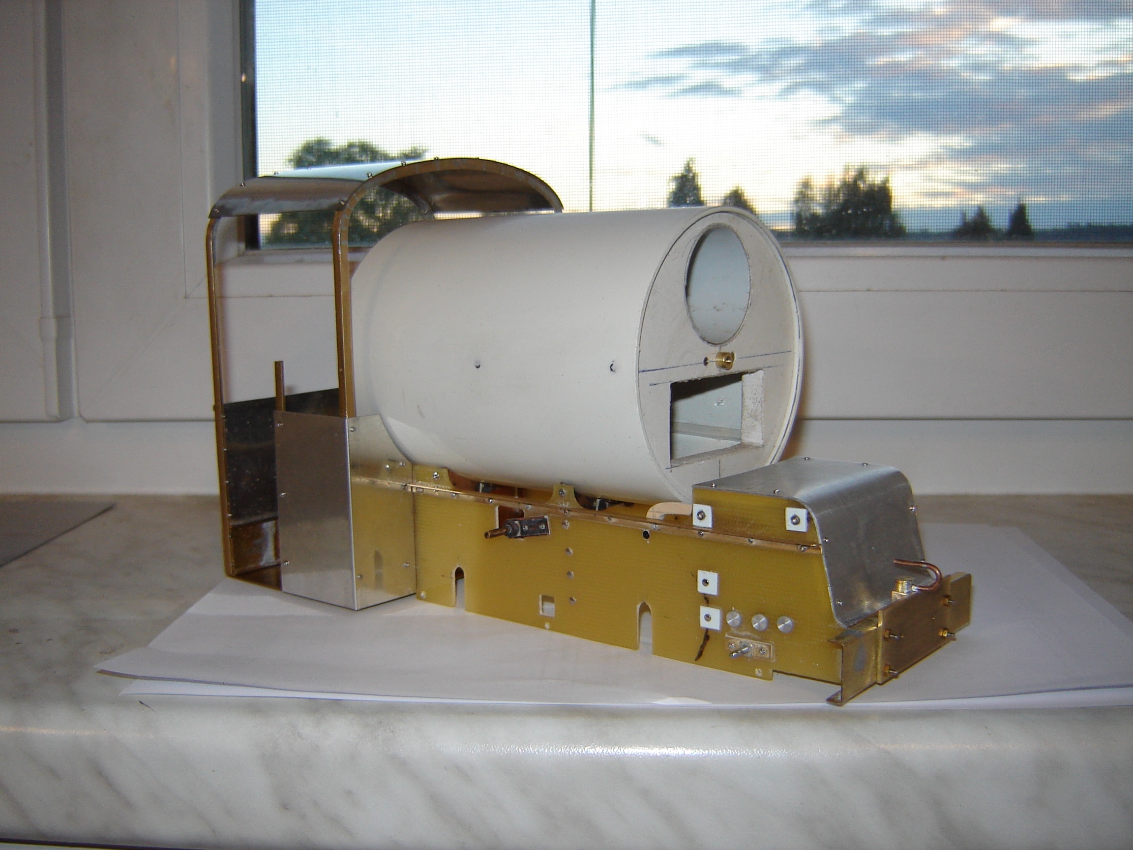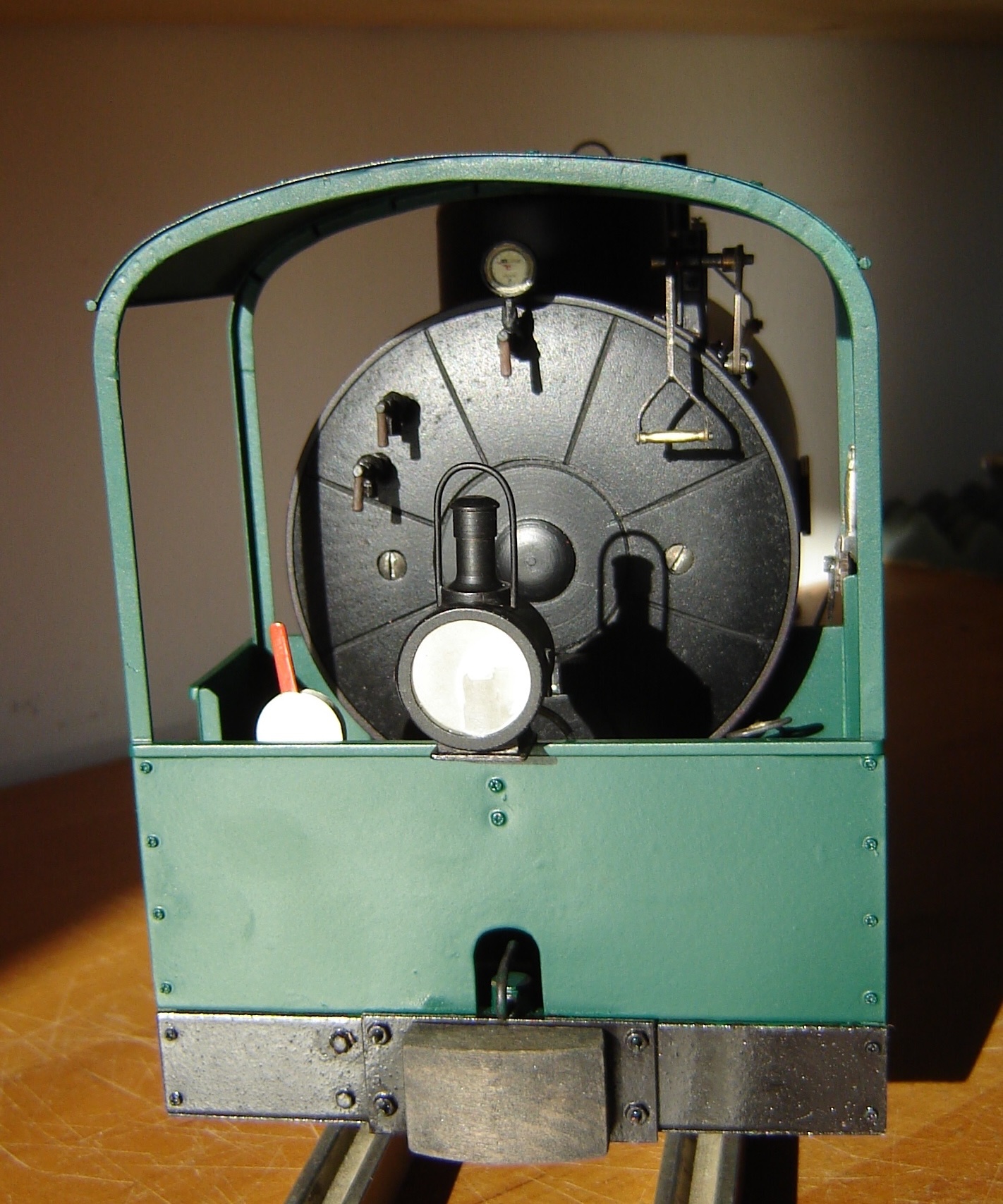 dem Einen oder Anderen mag sie vielleicht bekannt sein, die feldbahnspurige Dampfspeicherlok der Firma Hohenzollern von 1903. Diese Lok habe ich versucht, im Modell nachzubauen. Zur Verfügung hatte ich eine Skizze mit den Hauptabmessungen sowie einige wenige Fotos. Deshalb mussten einige kleine Details aus meiner Phantasie hinzuerfunden werden, ich hoffe aber, sie verfälschen nicht das Gesamtbild. Verwendete Materialien sind GFK-Platten für den Rahmen, ein zurechtgebogenes Kunststoffrohr für den Kessel sowie Weißblech und Messingprofile für das Führerhaus. Das Getriebe besteht aus 2 Hartgewebeplatten, in deren Mitte ein Getriebemotor sitzt und über ein Kegelradpaar die Hinterachse antreibt. Die Vorderachse wird über die Kuppelstangen bewegt. Im Kessel verstaut sind 2 Li-Ion-Akkus 18650 in Reihe sowie die Funkfernsteuerungselektronik. Die Umschaltung der Loklaternen erfolgt automatisch entsprechend der Fahrtrichtung.
