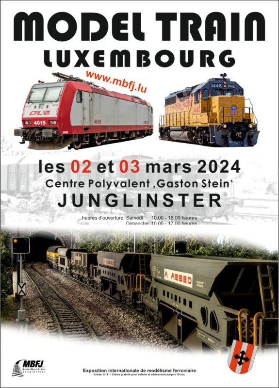 am 02. und 03. März 2024 findet in Junglinster wieder die große und internationale Modelleisenbahnausstellung "Model Train Luxembourg" statt. Es werden zahlreiche und hochwertige Modelleisenbahnen in verschiedenen Maßstäben ausgestellt. Darüber hinaus finden verschiedene Workshops rund um das Thema Modelleisenbahn statt. Auch Vereine, Fachhändler und Kleinserienhersteller werden vertreten sein. Ein Besuch lohnt sich.