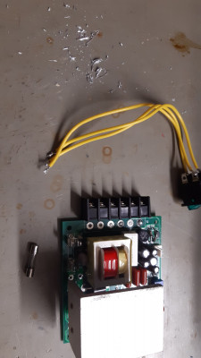 Benutzt wird ein DS-51 Gleichstromregler in der 220V DC Variante. den habe ich für 25 Euro bei Amazon bekommen (direkt aus China gesendet). Da drinne sind 3 gelbe Strippen zum Schalter, eine ohne erkennbare und messbare Funktion. Diese wurden abgelötet ... Und der Schalter gebrückt. Die Platine wurde auch noch mit Isopropanol von den riesigen Mengen Flussmittel gesäubert. Dann kam die originale Platine aus der Säge heraus. Die war da übel eingespannt, bestimmt 5 mm durchgebogen weil zu breit. Man sieht, dass die großen Dioden zum weißen Kabel hingehen, dieses ist also das +. Die neue Platine ist angeklemmt, ein PE Kabel muss auch mit raus, weil die neue Schaltung da nicht dran klemmt. Die alte Platine und das neue Gehäuse wandern in die Bastelkiste.