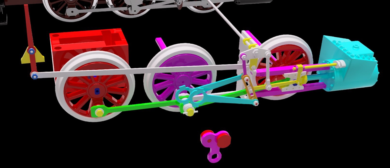 Rahmen und Getriebe mit Pleueln vom Typ „Allan“ aus lasergeschnittenem Metall, bearbeitet mit einem 3D-Cutter.