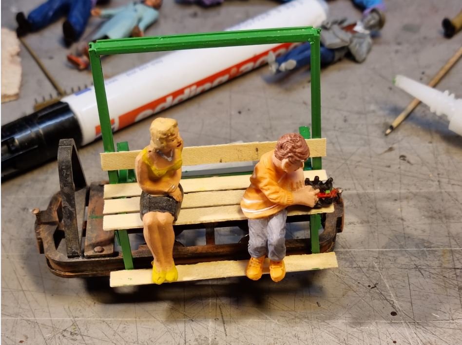 Auf die Rahmengestelle wurden Holzlatten aufgeschraubt . Die Wagen wurden in einem auffälligen Grün lackiert . Erste Sitzprobe der Chefsekretärin mit Sohn ( auch schon im Modellbahnfieber ) .
