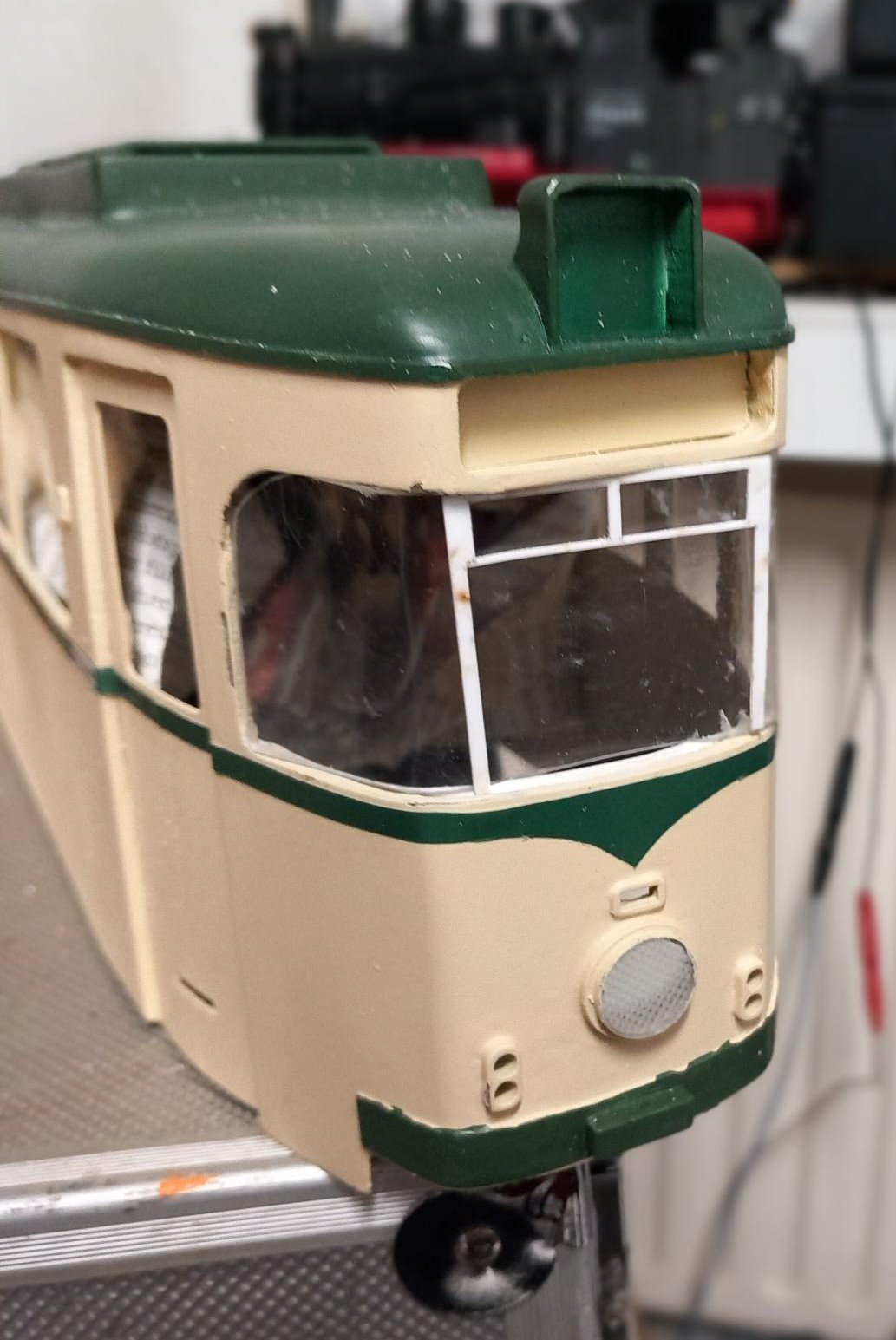 Bei den Fenstern arbeite ich mit Schablonen aus Karton. Dann rantasten und mit Sekundenklebern verkleben, "Gummidichtungen aus schwarzen Kabeln runden das AUssehen ab, ZUr Zeit laufen Versuche die Scheiben fü einen Hagener Gt 6 herzustellen.