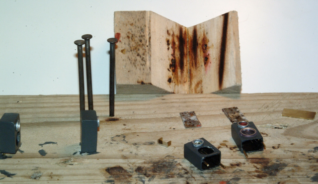 Die Seitenwaende sind aus gewinkelten Messingprofil (man sieht noch ein kleines Stueck auf dem Holzbrett, im Hintergrund sieht man einen primitiven Holzklotz mit einer 90 Grad Einbuchtung, welcher dazu diente die Werkstueck im geeigneten Winkel zu halten. Hatte auch mal zwischenzeitlich versuche mit den Naegeln angestellt.