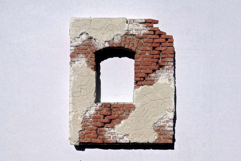 Den Verputz habe ich als 0,5mm dicke Platte wiederum aus Gips separat hergestellt (2 Stk. 0.5mm starke Leisten auf eine Klarsichtmappe aufgeklebt und mit einem Stahllineal abgezogen). Ich verwende Gips immer pur ohne irgendwelche Zugabe von Leim oder anderen Zuschlagsstoffen, da die Eigenstabilität auch bei einer Wandstärke von 0,5mm immer noch sehr gut ist. Die separat hergestellte Platte habe ich mit Weissleim auf das Wandstück an die vorgesehenen Stellen aufgeklebt. Die jetzt sichtbaren Risse habe ich direkt nach dem Aufkleben durch drücken und seitliches Verschieben mit den Fingern hergestellt