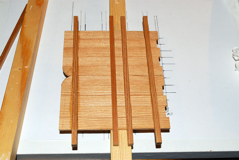 Die Mini-Arbeitsplatte war bei dieser Etappe deshalb so hilfreich, weil man diese Arbeiten ohne Lärm und üble Gerüche (Holzleim stinkt nicht) auch im Wohnzimmer ausführen kann und dadurch etwas mehr Zeit mit der Familie verbringt - und trotzdem jederzeit unterbrechen und die Arbeitsplatte verstauen kann, ohne umständlich alles vom Tisch räumen und verstauen zu müssen. Wer wenig Platz für sein Hobby hat oder den Modellbau auch in der guten Stube betreiben möchte ohne jedesmal Zeit mit Auf-, Um- und Abbau zu vergeuden, dem möchte ich eine solche Arbeitsplatte empfehlen. Zum Abschluss noch ein Bild von der letzten Verleimung.
