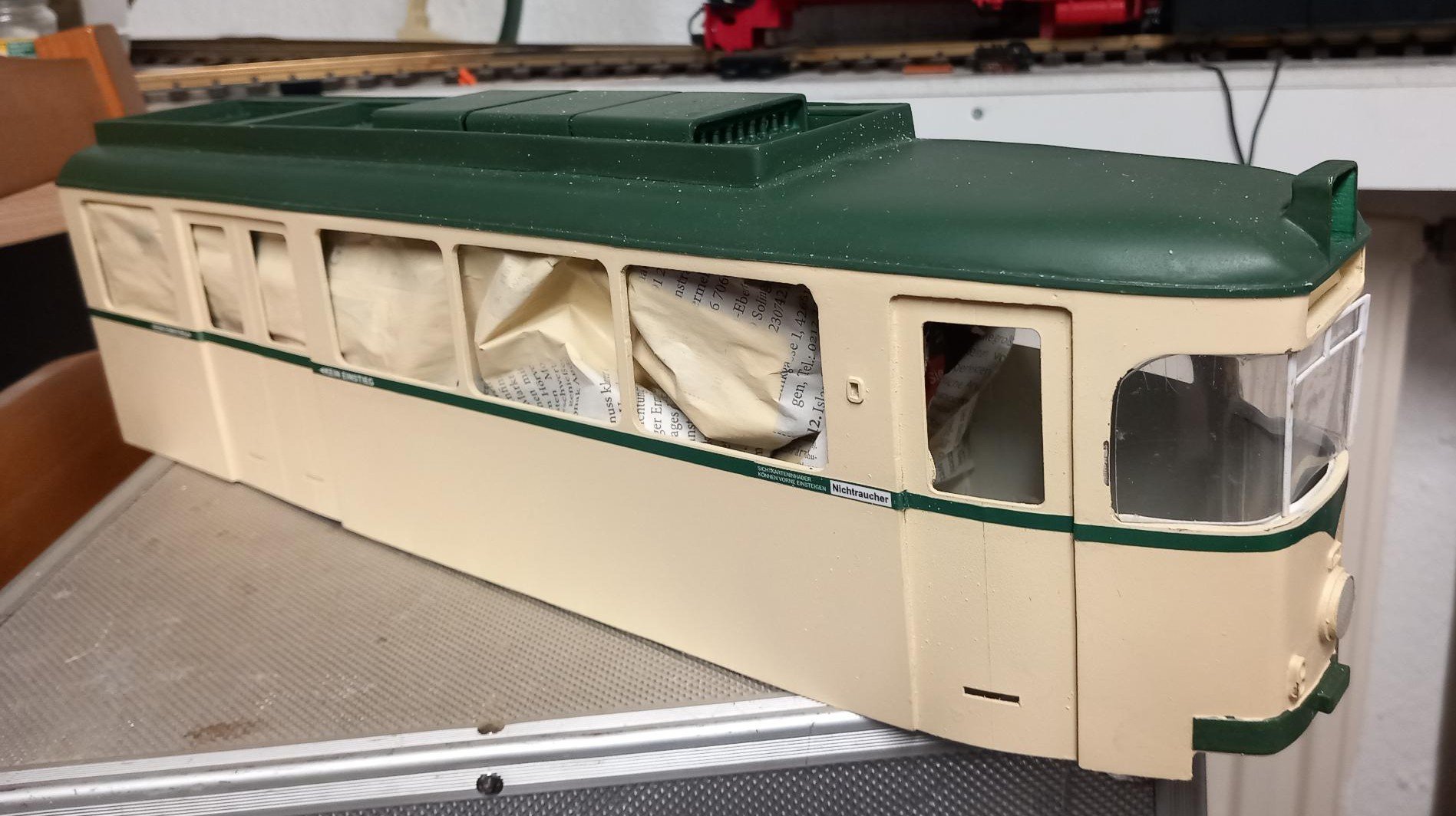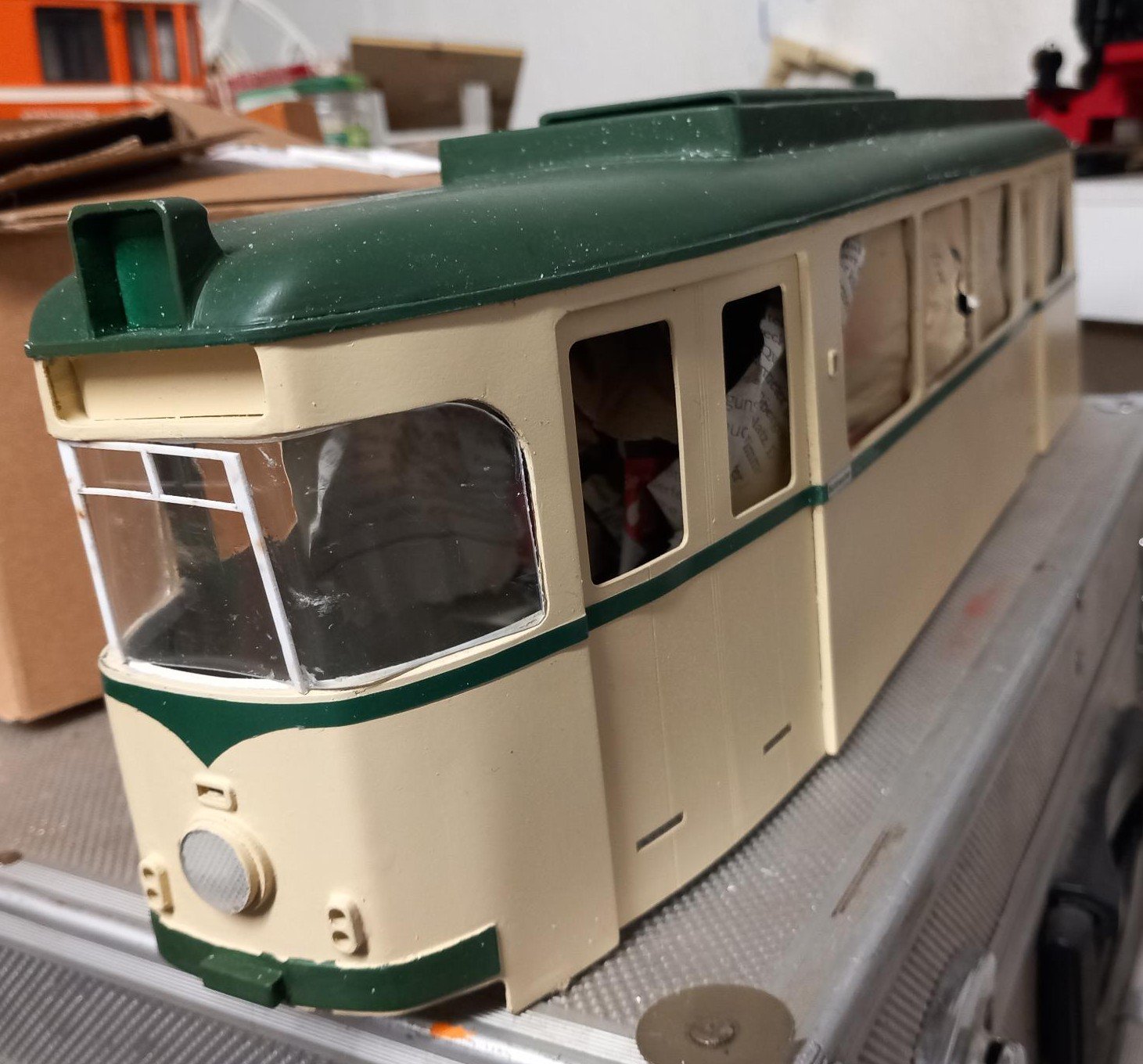 Bei den Fenstern arbeite ich mit Schablonen aus Karton. Dann rantasten und mit Sekundenklebern verkleben, "Gummidichtungen aus schwarzen Kabeln runden das AUssehen ab, ZUr Zeit laufen Versuche die Scheiben fü einen Hagener Gt 6 herzustellen.