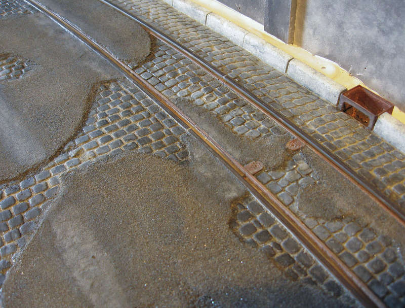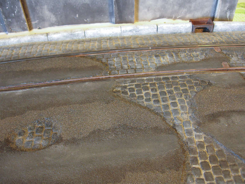 Nach dem Färben, Einsanden und Verkleben des Pflasters habe ich dann mit der Asphaltdarstellung begonnen. Ich habe zunächst das