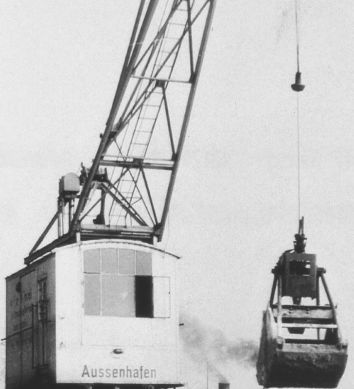 Bei der Sandverladung aus mehreren nebeneinander liegenden Schiffen hinüber zu den Ablageplätzen oder Trichter auf dem Kai musste der Ausleger ständig verstellt werden. Ich kann mich noch deutlich an die Geräusche erinnern, als wir Kinder zum Ärger des "Meisters" (Kranführer)auf den Sandhaufen spielten. Leider habe ich damals noch keine Fotos gemacht