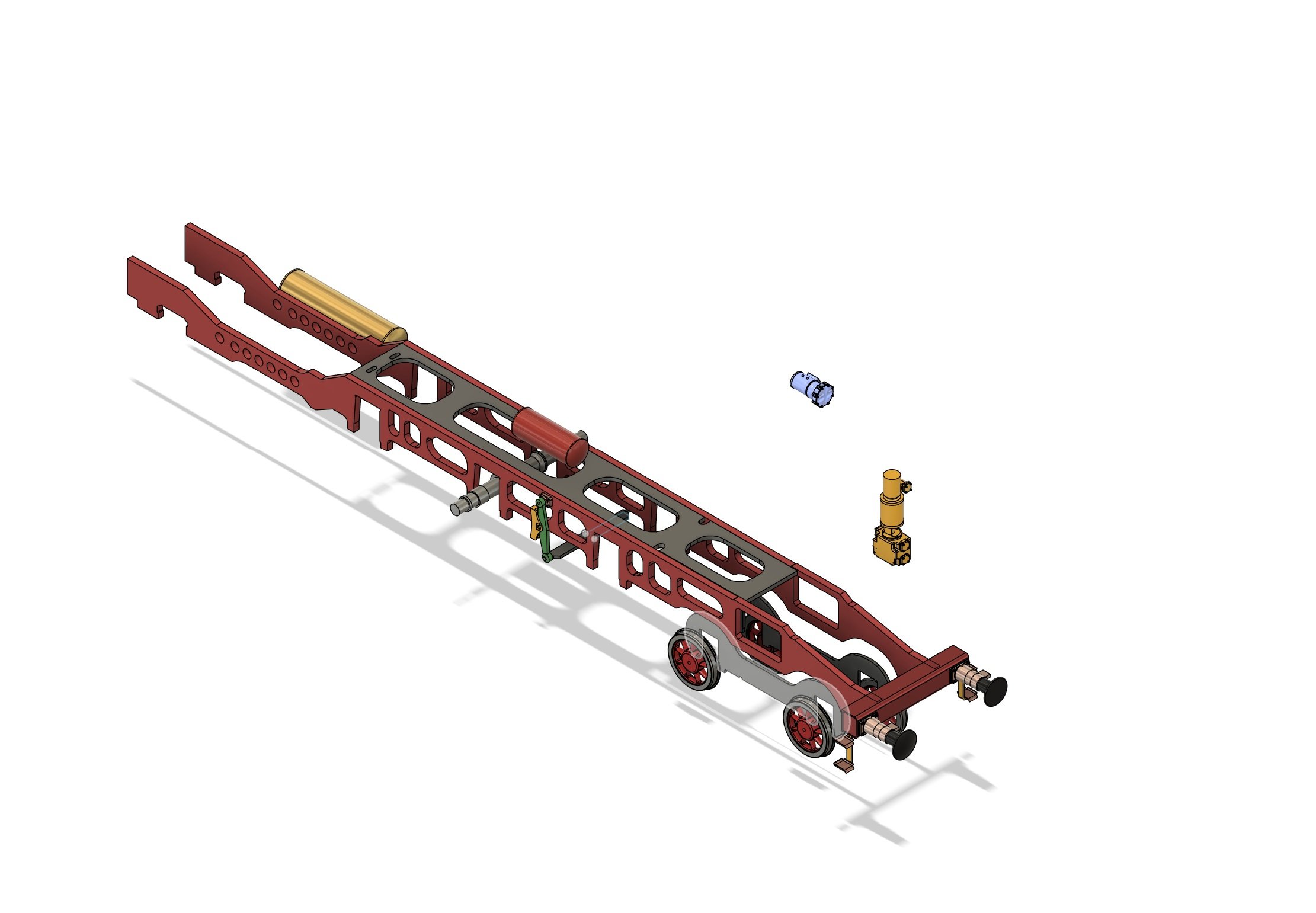 Wenn man sich noch mehr Arbeit macht, könnte man für den gesamten Bereich der drei Treibräder ein "Inlay" fräsen und so in den Rahmen einbringen, dass dieser auch an den Durchbrüchen ca. 5mm Stärke hat. Die Verbindung des mittleren Rahmenteils mit dem hinteren Rahmenteil könnte in dieses "Inlay" integriert werden. Das wäre wahrscheinlich immer noch weniger Aufwand als den ganzen Rahmen neu zu machen. Ein aus einem Blech gefräster Rahmen besitzt nämlich noch keine Details wie Nieten oder Verschraubungen.