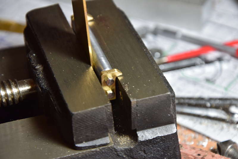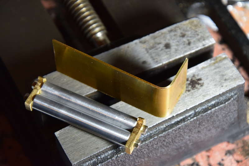 Da in den nächsten Tagen schon die Fertigung der Wasserkästen stattfinden soll, musste für die Rundung, welche beim Original an der vorderen Kastenseite vorhanden ist, eine geeignete Biegevorrichtung angefertigt werden. Freestyle im Schraubstock, mit einem Stück Rundmaterial, hatte sich in der Vergangenheit als zu instabil und daher auch ungenau erwiesen. Daher habe ich aus 3mm MS 58 die zwei Wangen für die Vorrichtung gefräst und dazu Alustäbe D=8,2mm mit 3mm Gewinde versehen. Die Stäbe sitzen ohne Spiel aneinanderund sind mit vier M3 Edelstahlschrauben montiert. Die Kehle bei den "Klauen" werde ich noch winklig ausfeilen, um die Lage im Schraubstock besser zu definieren.