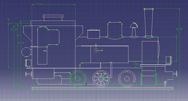 Die hier abgebildete Skizze war die erste Grundlage, um das C-Kuppler-Fahrgestell der Fa. Regner ins proportionale Verhältnis zum Original der Lokomotive zu bringen. Im Laufe der weiteren Konstruktion waren zahllose Angleichungen nötig... Es handelt sich noch nicht um die finale Version. Es hat sich gezeigt, daß alle Ansichten ( 4 Seiten-Riss ) zu erstellen waren, da beim Umsetzen in 3D und später in die Fräsdaten für EstlCam Fehler ausgeschlossen werden können.