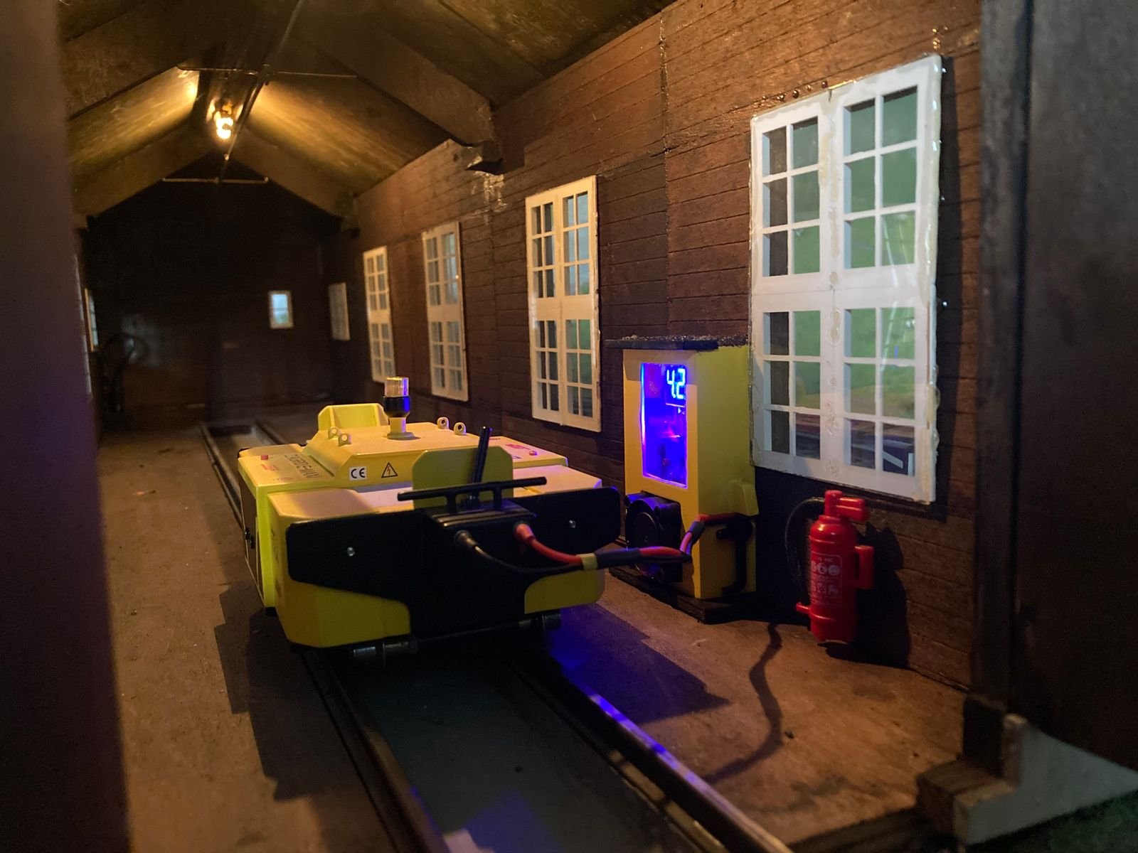 Für die Beleuchtung habe ich neue Glühbirnchen, Kabel uns Stecker verwendet. Zusätzlich habe ich die Remise mit einem standesgemäßen Ladegerät für den Taf 2/2 29591 ausgerüstet. Die Optik ist vorbildähnlich und verfügt über ein winziges LiPo Lademodul für eine Zelle, eine Voltanzeige und ein 5 V Step-Down Regler mit Lüfter 24V, aber mit 12v Festspannungsregler, vervollständigen das Ganze in einem gelben Gehäuse aus Plaste. Ein Feuerlöscher - natürlich für Metallbrände wie Lithiumakkus