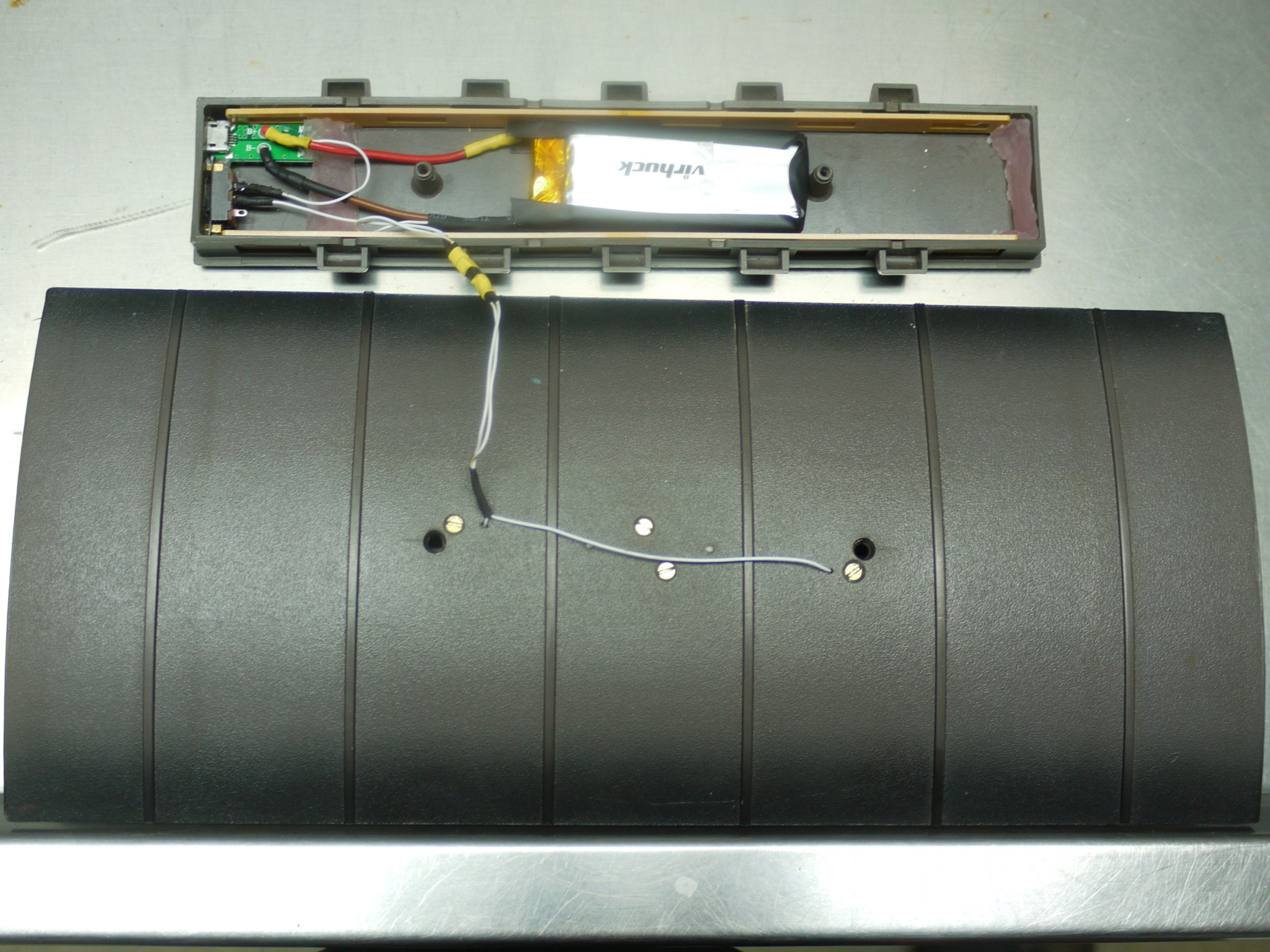 Für die Beleuchtung hatte ich die Idee, diese im Oberlicht so unterzubringen, dass keine Leitungen durch das Wageninnere verlaufen mussten. Als Stromquelle habe ich kleine 1s-LiPo Akkus (eigentlich für eine Drohne) verwendet, die gleich eine Mini USB Ladebuchse mitbrachten. Die orangenen Fensterrahmen der Dachfenster wurde erstmal auch elfenbeinfarben lackiert. Danach wurden die Löcher für die USB-Buchse und einen kleinen Schiebschalte von Hand eingefräst und etwas nachgefeilt. Die Teile wurde ordnungsgemäß verdrahtet und isoliert. Die Verbindung mit den Leuchten findet über Mikrostecker statt, so dass man das Dach mit Akku zu Reparaturzwecken leicht entnehmen kann. Der LiPo-Akku wird aber von außen geladen.