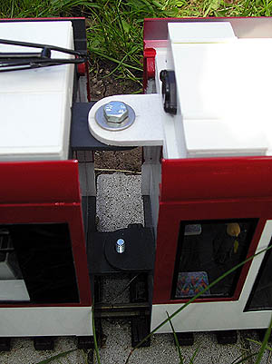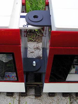 da es hier Fragen zu der Gelenkverbindungen gab, möchte ich Euch meine Lösung kurz vorstellen. Das erste und dritte Gelenk ist als Nick- Wank- Verbindung ausgelegt. Die Wagenkästen sind nur im unterem Bereich miteinander verbunden, oben sind sie in allen Richtungen frei beweglich. Beim Transport wird oben eine Schraube eingesteckt, so daß nur noch eine Knickbewegung möglich ist.