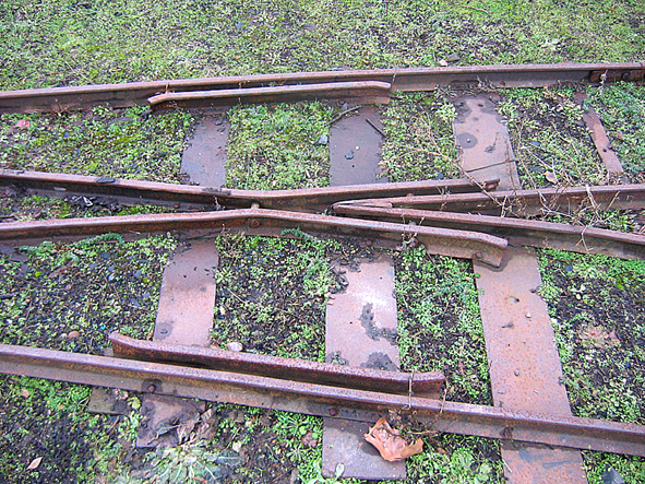 eine Schleppweiche, wo nur noch die Zungen und der Antriebsmechanismus fehlen .